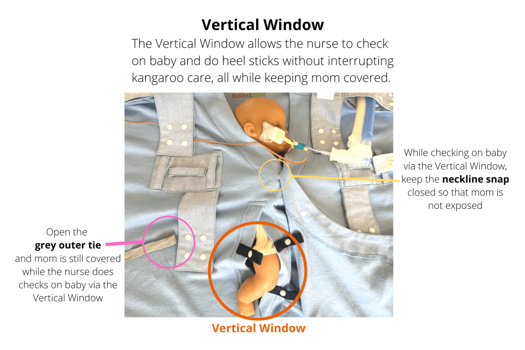 The vertical access window allows the nurse to check on baby without disturbing kangaroo care all while keeping the parent covered.